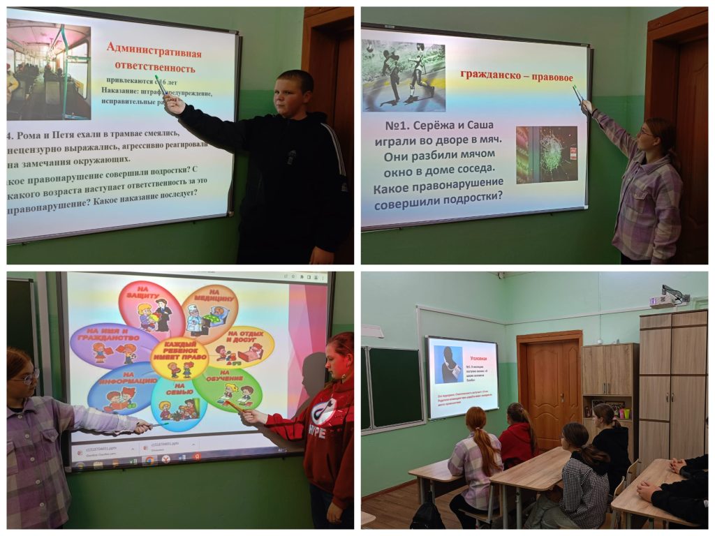 На занятии ребята совместно разобрали конкретные ситуации, которые помогают понять различные виды ответственности и права.