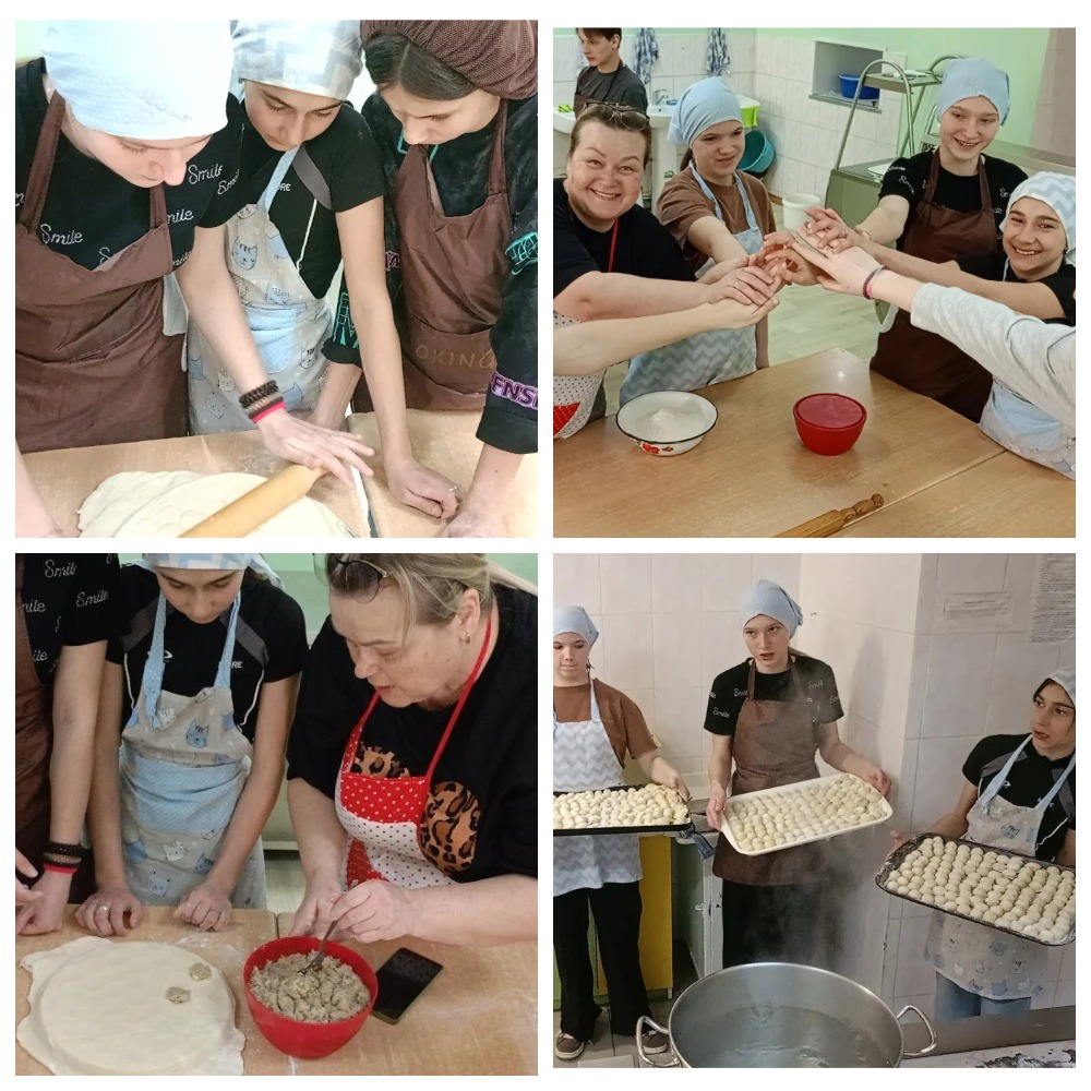 Сегодня у нас в гостях Благотворительный фонд «Забота» г. Пензы. Первое занятие по проекту «Весёлая кухня: путь к самостоятельности» — «Домашние пельмени». Ребята не только узнали историю этого любимого всеми блюда, но и научились правильно замешивать и раскатывать пельменное тесто. А потом самостоятельно налепили 750 штук пельменей. В конце занятия все вместе попробовали то, что приготовили своими руками.