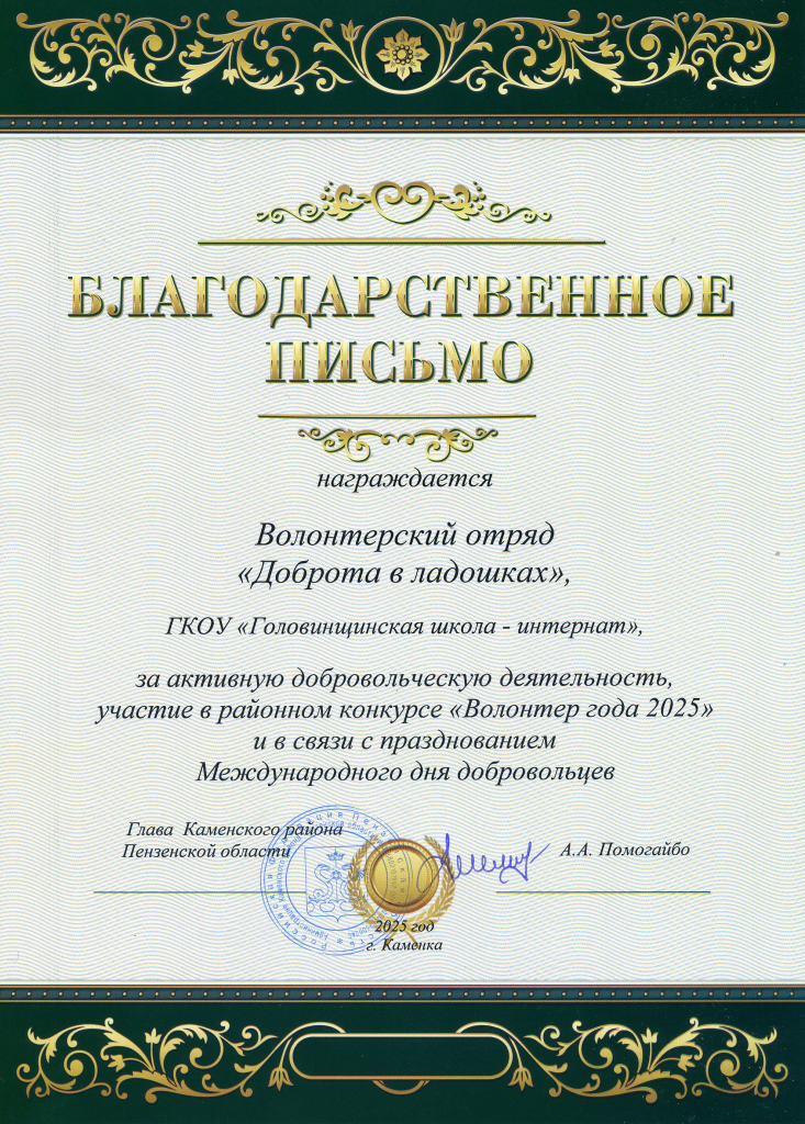 С гордостью сообщаем, что наши воспитанники также участвовали в этом важном событии! Наш волонтёрский отряд «Доброта в ладошках» проделал огромную работу, совершив множество добрых дел и был отмечен Благодарственным письмом Главой Каменского района А.А.Помогайбо. Мы не знаем, кем станут в будущем участники волонтёрского отряда школы, но хочется верить, что они всегда будут делать добро, потому что растут неравнодушными людьми.